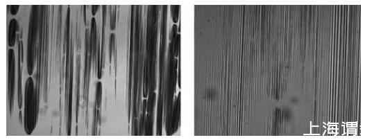 圖5在透射光顯微鏡下,疏水蛋白在40 mN m-1下的壓縮。左側放大4倍,右側放大10倍。