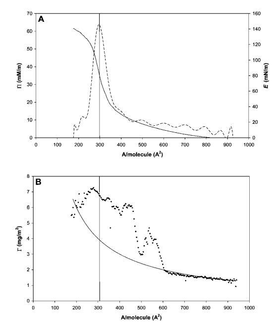 圖3 HFBII的代表性壓縮等溫線,壓縮量遠低于每個分子的面積。 (A) P(-)和E(---)與每個分子的面積的關系。 (B) 攤鋪量和壓縮(Gcomp,-)預期的表面載荷,并通過橢偏儀(Gell,A)測量。