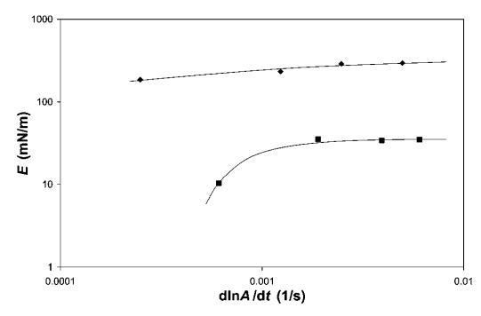 頻率依賴性。 為了評估其中一些系統中粘性損失的重要性,我們對b-lg和HFBII進行了頻率相關的表面膨脹流變。 對于表面膨脹流變學,我們顯示了在18<P<22 mN m-1之間測量的小變形模量(見圖10)。 注意,變形率d(lna)/dt為0.0012 s 1對應于5 mm min 1的勢壘速度,用于大變形實驗。 相比之下,歧化時間約為0.5小時,接近泡沫實驗觀察到的粗化時間。 HFBII的數據表明,在所研究的變形速率范圍內,變形速率對E的影響適中。 對于b-乳球蛋白,頻率的影響更為明顯,因此,在變形速率低于0.001 s 1時,可觀察到E的強烈下降。 這表明b-lg的粘性損失比HFBII更為明顯。 這一比較再次表明,b-lg的外觀更柔軟,壓縮/膨脹時解吸/吸附能力更強。