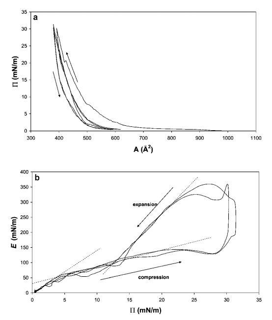 b-乳球蛋白。圖7顯示了b-乳球蛋白的壓縮等溫線。這條曲線遠沒有HFBII曲線陡峭,拐點更為明顯。盡管在屏障運動逆轉時觀察到滯后現象。E–P曲線的初始斜率為4.3,遠小于低P區的HFBII,表明b-lg分子在界面中相對較軟。觀察到E的平滑最大值為43 mN m-1,之后在進一步壓縮至28 mN m-1時,不再檢測到E的恢復。結果與早期的研究結果一致。40,41在屏障逆轉時,觀察到E的超調,再次表明結構無法適應突然膨脹和斷裂。