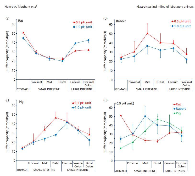 圖1(a)來(lái)自大鼠(n=3),(b)兔子(n=6),(c)豬(n=3)的混合樣品的胃腸液(上清液)緩沖容量(平均值±標(biāo)準(zhǔn)偏差(SD)),在pH單位變化0.5和1.0時(shí)測(cè)量,以及(d)整個(gè)胃腸道緩沖容量的種間趨勢(shì)。