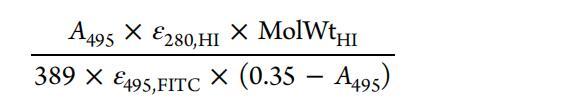 熒光光譜法用于選擇含有FITC-HI的小份樣品。 FITC探針在494nm激發(fā)時顯示出517nm的發(fā)射。 人們注意到,當(dāng)探針與HI共軛時,F(xiàn)ITC發(fā)射的強(qiáng)度增加。 吸收光譜法用于確定HI與FITC的比率,該比率由下式計算得出。21