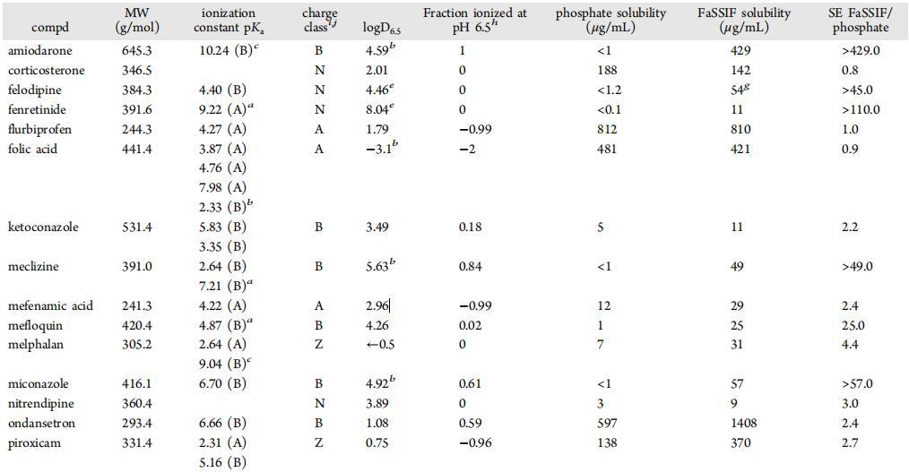 在FaSSIF和水性緩沖液中的溶解度評估和物理化學(xué)特性。選擇了一組21種上市藥物和30種來自不同研究項目的羅氏化合物,因為它們在pH值為6.5的水性緩沖液和FaSSIF介質(zhì)中的溶解度不同。作為標(biāo)準(zhǔn)做法,所有溶解度和表面壓力剖面測量均在室溫下進(jìn)行,而不是在37°C下進(jìn)行。盡管溫度可能會影響藥物溶解度、脂質(zhì)聚集體分配和溶解,據(jù)報道,牛磺膽酸膠束的聚集數(shù)對溫度變化相對不敏感。19該化合物組包含不同的化學(xué)性質(zhì)、廣泛的親脂性,并涵蓋不同類型和程度的電荷狀態(tài),包括中性、酸性、堿性和兩性離子分子。表1列出了主要理化性質(zhì)和溶解度數(shù)據(jù)。