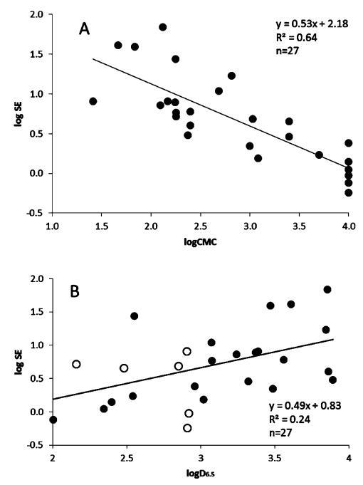 圖5。根據(jù)對數(shù)CMC(μM,A)和pH 6.5下的辛醇分配系數(shù)(logD6.5;B)繪制溶解度增強(qiáng)曲線。數(shù)據(jù)集僅限于顯示logD6的化合物。5個在2到4之間。圖B中的開放圓對應(yīng)于從文獻(xiàn)檢索、預(yù)測或從pH值為7.4的logD推斷的logD值。高于或低于檢測限的值在檢測限處繪制。