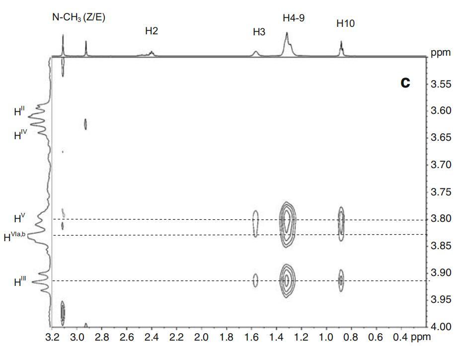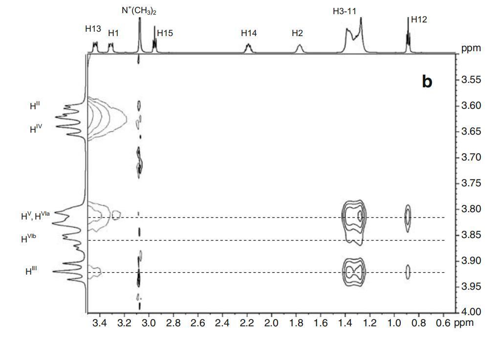 圖7a顯示了α-CD、DPS和Mega-10的示意圖,以簡化表面活性劑原子與CD原子的相互作用。2DROESY數據證明表面活性劑的烷基鏈包含在α-環糊精的疏水腔中。光譜如圖7b和c所示??梢钥吹奖砻婊钚詣┕舱衽c位于環糊精空腔內的HIII、HV和HVI共振的交叉峰。未觀察到分子(HI、HII和HIV)外部與環糊精原子的相互作用。對于這兩種表面活性劑,與HIII和HV的相互作用似乎覆蓋了從末端甲基到H3的整個烷基鏈。這意味著幾個不同的復雜幾何形狀和穿透深度之間的快速交換。在鎘原子和親水性頭基之間沒有觀察到相互作用。