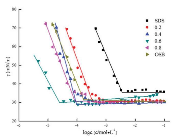 在25℃下測量了不同摩爾比的單獨OSB、SDBS和OSB/SDBS混合體系的表面張力。OSB/SDB(αOSB)的比率從0.2,0.4,0.6更改為0.8,總摩爾濃度固定為0.1 mol/L。圖7說明了濃度與表面張力之間的關系,表4總結了表面張力參數。
