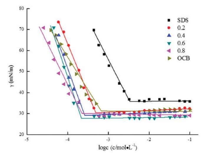 在25℃下測量了不同摩爾比的OCB、SDBS和OCB/SDBS混合體系的表面張力。OCB/SDB(αOCB)的比率從0.2,0.4,0.6更改為0.8,總摩爾濃度固定為0.1 mol/L。圖5說明了濃度與表面張力之間的關系,表2總結了表面張力參數。