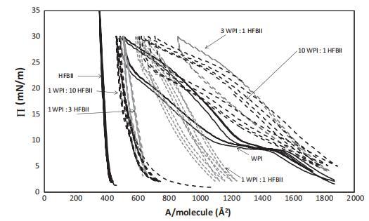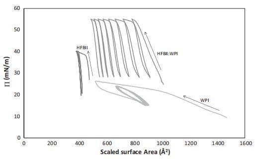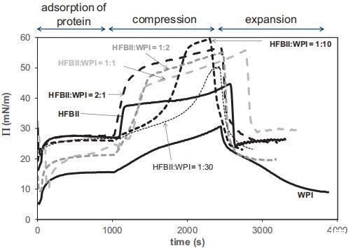 值得注意的是,對于純HFBII,П–A等溫線在連續的壓縮膨脹循環中不會發生變化,這再次表明HFBII不可撤銷地附著在界面上,幾乎沒有任何構象變化。對于純WPI和1:1混合物,П–A等溫線略微向較小區域移動,這表明由于WPI分子的構象變化、多層形成或如前所述,由于WPI的解吸,表面重排的可能性較小。