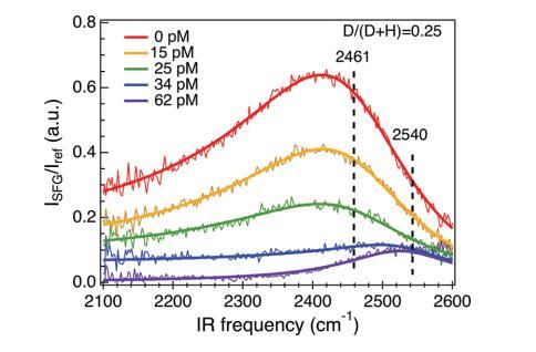 觀察到OD拉伸共振頻率的變化,證明了界面水的結構隨著DNA的吸附而發生變化。因此,與我們之前的結論相反,陽離子脂質的界面水VSF強度的降低不能完全由表面電位的降低來解釋。48也就是說,添加陽離子脂質的DNA后,界面水明顯重組。隨著DNA濃度的增加,HOD譜向更高頻率移動,這表明界面水的平均氫鍵強度降低。例如,在反膠束中所含的欠配位水中,已經觀察到平均氫鍵強度弱于水在本體中所經歷的氫鍵強度。70,71