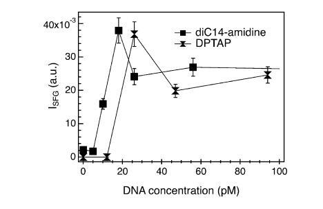 圖7。(上圖)在不存在(紅線)和存在(藍線,150μm)DNA的情況下,磷酸緩沖亞相上方的diC14氨基單層的π-面積等溫線。對于給定的脂質密度,將DNA添加到亞相會導致表面壓力增加,或者相當于脂質分子的凝聚。(下圖)不同濃度的DNA溶液上的CH2SS和CH3SS共振(三角形和圓形,右軸)的VSF強度及其比率R(正方形,左軸)。實線是眼睛的向導。