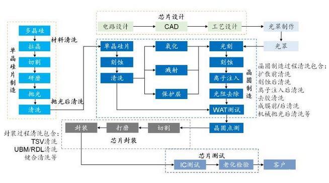 芯片制造技術(shù)的進(jìn)步驅(qū)動(dòng)半導(dǎo)體清洗技術(shù)快速發(fā)展。在單晶硅片制造中,光刻,刻蝕,沉積等工藝后均設(shè)置了清洗工藝,清洗工藝在芯片制造進(jìn)程中占比最大,隨著芯片技術(shù)節(jié)點(diǎn)不斷提升,對(duì)晶圓表面污染物的控制要求也越來(lái)越高。