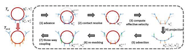 我們的耦合系統(tǒng)分為三個部分:流體,表面層,固體。流體部分我們采用傳統(tǒng)的歐拉網(wǎng)格的模擬方法,在交錯網(wǎng)格(Staggered Grid)上用算符分離的方法求解離散不可壓的Navier Stokes方程。固體部分采用傳統(tǒng)的拉格朗日方法求解牛頓方程。我們的主要貢獻在于在流體與固體之間插入了一層有質量、有厚度的流體表面層,這個表面層直接對應我們上面介紹的流體表面分子稀疏的部分。因為這個表面層非常薄,我們可以使用帶虛擬厚度的單層三角網(wǎng)格來表示,然后在這個表面層上施加表面張力勢能。為了將這三個部分耦合起來,我們在表面層和背景網(wǎng)格、固體和背景網(wǎng)格之間定義了速度的插值矩陣,同時將流體的壓強作用在表面層和固體上,以及將表面張力作用在固體上,這樣我們將這三部分寫進一個三相耦合方程里進行統(tǒng)一求解和更新。最終我們算法的流程如下: