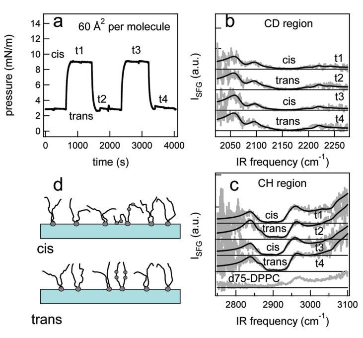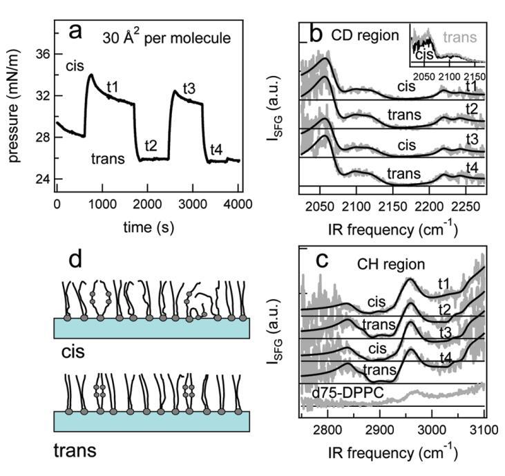 圖7:。結果:對于1:5的DT Azo-5P/d75 DPPC混合物,在脂質/水界面上,每個分子的面積為30?2。(a)表面壓力與時間的關系。370和450 nm光照射~100秒分別產生cis(高壓)和trans(低壓)狀態。壓力的微小劇烈波動是由于樣品高度的變化,以校正水的蒸發。順式狀態下表面壓力的降低可能是由于單層的松弛或膠束或囊泡的形成減少了表面的脂質量。(b)相應的VSFG光譜(灰色)以及CD區域的擬合。為了清晰起見,對光譜進行了偏移。插圖顯示了相互重疊的反式和順式光譜,以強調差異。(c)VSFG光譜(灰色)與fits一起引導眼睛進入CH區域。底部曲線顯示了P下純d75 DPPC的光譜~40 mN/m.(d)脂尾方向示意圖。光開關脂質的偶氮苯部分用灰色圓圈表示。