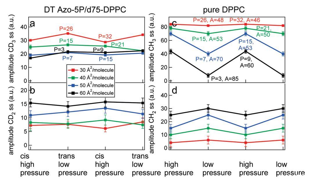 圖8:。d75 DPPC與DT Azo-5P比例為5:1的實驗中d75 DPPC的擬合結果(左)和純正常DPPC的擬合結果(右)。(a)CD3對稱拉伸振動模式的振幅隨不同密度光開關脂質狀態的變化;(b)CD2對稱拉伸振動模式的振幅隨不同密度光開關脂質狀態的變化;右圖顯示了純DPPC在可比壓力下與左圖相似的結果,其中(c)為CH3對稱拉伸振動模式的振幅,(d)為CH2對稱拉伸模式的振幅。共振的寬度和頻率在擬合中是固定的。