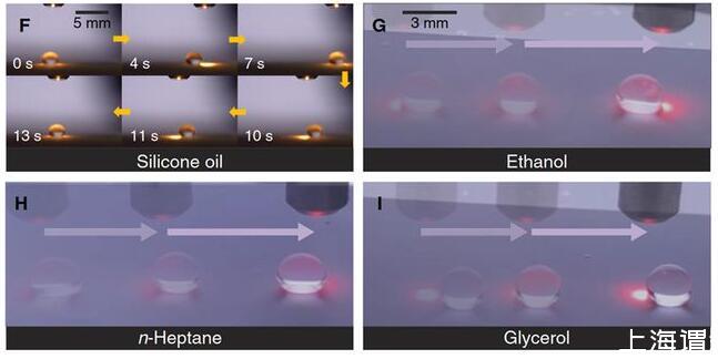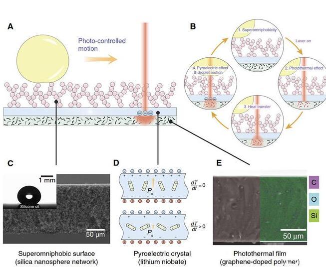 光電微流控平臺的設計:微流控平臺包括底層的光熱薄膜(石墨烯摻雜的PDMS),中間層的熱釋電晶體(LiNbO3)和上層的超疏液涂層(SiO2納米空心球分形網絡)(圖1)。光束可以穿過上層透明的超疏液涂層和熱釋電晶體照射到底面的光熱薄膜,光熱薄膜將光能轉換成熱能使自身溫度升高,從而加熱上方的熱釋電晶體在光束照射處產生表面電荷,當電荷引起的介電泳力足以克服液滴在超疏液涂層上的粘附力,液滴則被吸引至光束下方。超疏液涂層不僅為液滴移動創造了極低的阻力,而且避免了液體殘留,使得無損液滴操控成為可能,可以對包括硅油、乙醇、正庚烷和甘油在內的30多種液體(表面張力18.9-98.0mN/m)進行無損光控操作。