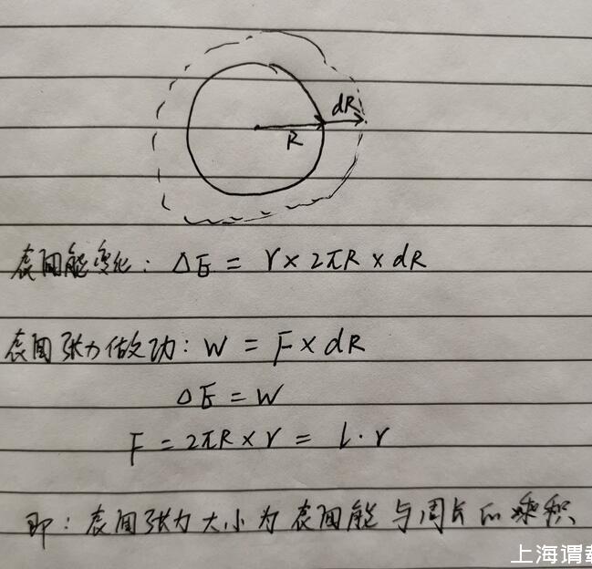 假設(shè)一半徑為R的圓面向外擴(kuò)張距離為dR,這個(gè)過(guò)程表面張力做功等于表面能的變化。具體推導(dǎo)如下圖。