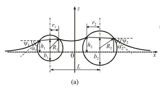 從能量的角度來看,液體表面能并不是由獨立放置單個小球時液面表面能的簡單相加,還要加上一項因另外一個小球存在時的相互表面能,其與小球之間的距離直接相關。這種相互表面能表現為沿小球連線方向的橫向毛細力。