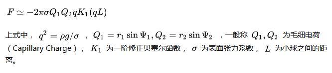 具體過程大家可以閱讀文末的參考文獻,這里直接給出在小顆粒和液面小變形下假設下,兩小球之間橫向毛細力的表達式,