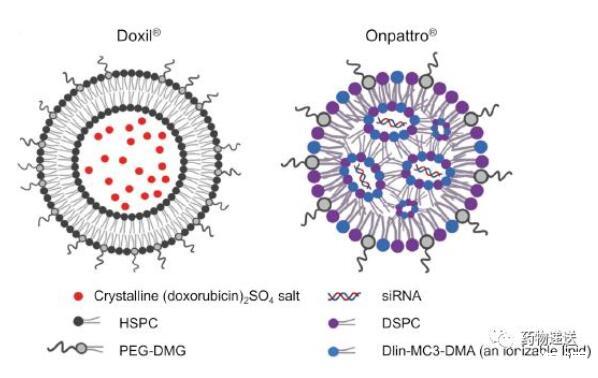 在組成方面,主要成分大致相同,都含有脂質(zhì)和膽固醇,只是脂質(zhì)納米粒所用的脂質(zhì)中必須要有可電離脂質(zhì),而脂質(zhì)體對(duì)脂質(zhì)的種類(lèi)沒(méi)有嚴(yán)格要求。但在各成分的比例方面,脂質(zhì)體和脂質(zhì)納米粒存在較大差異,尤其是膽固醇的用量,以經(jīng)典的脂質(zhì)體產(chǎn)品DOXIL為例,HSPC:CHOL:DSPE-PEG2000=3:1:1;而已上市兩款mRNA新冠疫苗的組分中,膽固醇分別占比42.7%(Pfizer/BioNTech)和38.5%(Moderna),明顯高于脂質(zhì)體中膽固醇的含量。