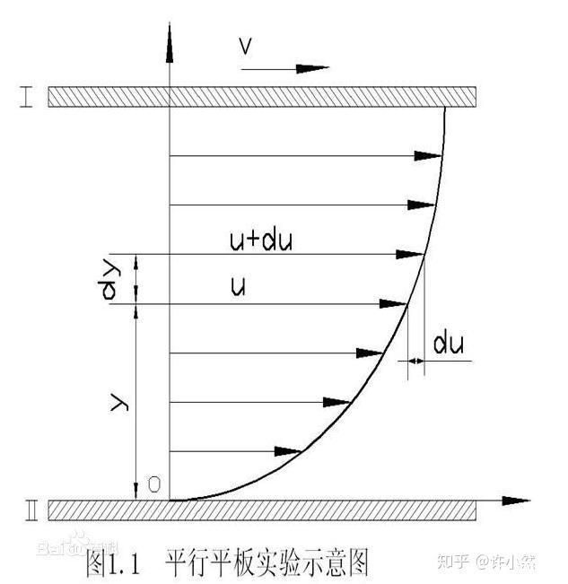 在這張圖中,下方的平板和兩個平板間的液體保持相對靜止,且液體內部沒有對自身體內不同質點的相對流動,而將上方平板做水平向右的推動??梢钥匆?,在與上方平板直接接觸的一層液面處可以達到與被推動的平板相同的速度,而在垂直距離上越遠離上層平板的部分的速度越慢,直到最下層與下方平板直接接觸的液面處速度為零,在兩個平板之間存在一個連續變化的速度分布。