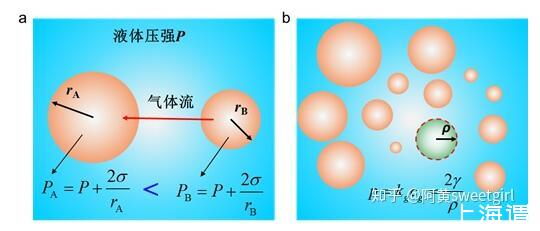 氣泡液體是大小不同的球狀氣泡分散到液體中的液氣體系。在氣泡液體中,大小不同氣泡是一個不穩定的體系,其內部不等的壓強會使整個體系變化,總體趨勢是氣泡半徑出現粗化現象,這種粗化跟晶體生長中的Ostwald熟化的現象是一致的(Ref 1)。根據附加壓力公式,可知較小的氣泡其內部具有較大的壓強,因此與旁邊較大的氣泡間就會存在壓強差(圖1a),氣泡間液體兩側的壓強差會使氣體從壓強較大的地方向較小的地方擴散,從而出現大的氣泡增大,小的氣泡減小直至消失的情形,這就是氣泡Ostwald熟化的機理(Ref 2)。從能量的觀點來說,Ostwald熟化的結果降低了體系的表面能,從而使整個體系更加穩定。