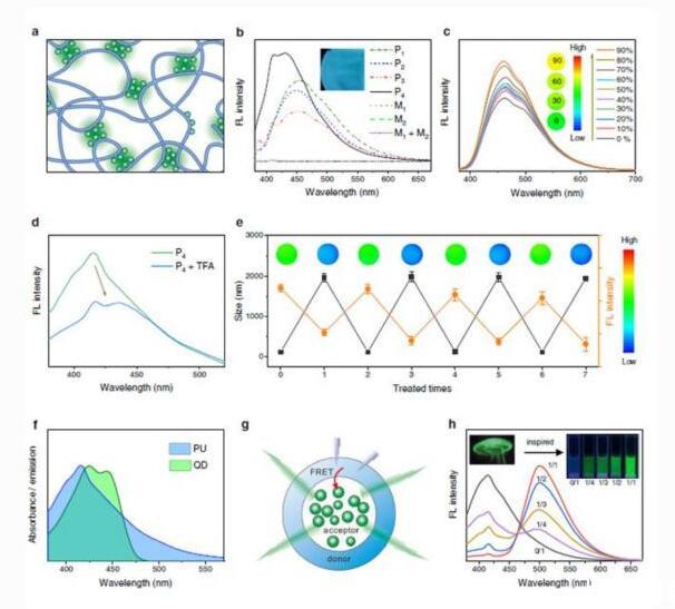 而當去除三氟乙酸后,熒光和粒徑又會恢復,并能進行多次循環(huán)。這種構象介導的變形現(xiàn)象和變色現(xiàn)象,與水母在呼吸時隨著膨脹和收縮,所表現(xiàn)出的熒光轉(zhuǎn)變行為十分相似。