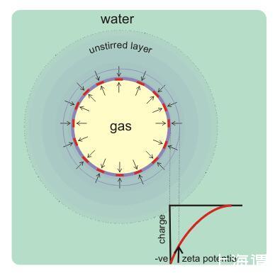 納米氣泡也存在比較強的靜電場,能避免氣泡發(fā)生融合,對抗浮力作用。在水平電場中,氣泡電荷決定于水平速度v=ζε/μ(v=水平速度,ζ=zeta電位(V),ε=水的介電常數(shù)(s2×C2×kg-1×m-3),μ=粘滯度(Pa×s).)