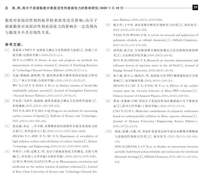 為了揭示高分子溶液黏度對(duì)表面活性劑表面張力的影響程度及規(guī)律,利用全自動(dòng)張力儀,通過Wilhelmy吊片法測定了4種表面活性劑(SDS、SDBS、油酸鈉、OP-10)水溶液的臨界膠束濃度以及加入不同黏度高分子(羧甲基纖維素、多元醇聚合物)溶液前后的表面張力。結(jié)果表明:加入不同黏度高分子溶液后,4種表面活性劑的臨界膠束濃度并沒有發(fā)生變化,但臨界膠束濃度對(duì)應(yīng)的表面張力均有小幅提升,且高分子溶液黏度對(duì)表面活性劑表面張力的影響在一定范圍內(nèi)與黏度并無明顯的線性關(guān)系;在加入黏度為14 mPa·s的羧甲基纖維素溶液后,SDS、SDBS、油酸鈉、OP-10在臨界膠束濃度對(duì)應(yīng)的表面張力分別為36.60 mN·m~(-1)、40.06 mN·m~(-1)、54.30 mN·m~(-1)、44.05 mN·m~(-1)。