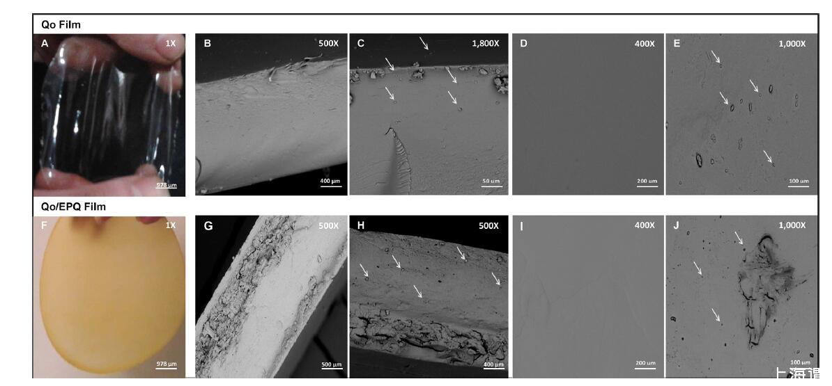 Qo和Qo/EPQ的印刷膜示于圖3A和F。圖3B示出了Qo膜的橫截面,圖3G示出了EPQ/Qo膜的橫截面。Qo膜具有均勻、柔軟、光滑、連續(xù)的結(jié)構(gòu),具有良好的完整性和孔隙。相比之下,混合膜具有帶有孔隙和裂縫的異質(zhì)結(jié)構(gòu)。Qo-乳清蛋白薄膜(Kurek、Galus和Debeaufor,2014年)和Qo-明膠薄膜(Kurek等人,2012年;Rivero、García和Pinotti,2009年;Torres、Aimoli、Beppu和弗雷利希,2005年)。這些作者將這些由碳水化合物和蛋白質(zhì)混合物制備的薄膜的異質(zhì)結(jié)構(gòu)歸因于干燥過(guò)程(溶劑前沿的遷移)。Qo/EPQ薄膜的干燥時(shí)間是Qo薄膜的1.8倍,表明水分子通過(guò)混合薄膜的擴(kuò)散速度較慢。此外,混合物的pH值(pH 3.8)接近藜麥蛋白的等電點(diǎn)(Abugoch,Romero,Tapia,Rivera,&Silva,2008),這可能會(huì)引發(fā)復(fù)雜的凝聚和某些蛋白質(zhì)組分的沉淀,導(dǎo)致Ferreira等人描述的熱力學(xué)不相容性。(2009),當(dāng)乳清蛋白和Qo的混合物被酸化以獲得混合膜時(shí),他觀察到了這種現(xiàn)象。