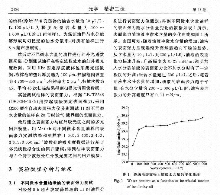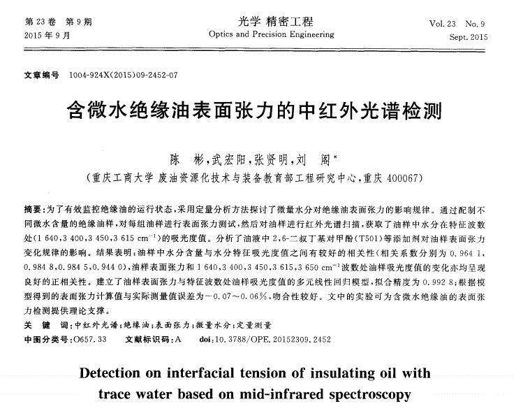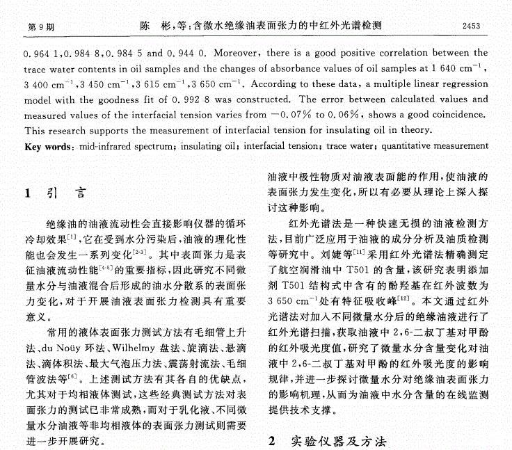 【摘要】:為了有效監控絕緣油的運行狀態,采用定量分析方法探討了微量水分對絕緣油表面張力的影響規律。通過配制不同微水含量的絕緣油樣,對每組油樣進行表面張力測試,然后對油樣進行紅外光譜掃描,獲取了油樣中水分在特征波數處(1 640,3 400,3 450,3 615cm-1)的吸光度值。分析了油液中2,6-二叔丁基對甲酚(T501)等添加劑對油樣表面張力變化規律的影響。結果表明:油樣中水分含量與水分特征吸光度值之間有較好的相關性(相關系數分別為0.964 1,0.984 8,0.984 5,0.944 0),油樣表面張力和1 640,3 400,3 450,3 615,3 650cm-1波數處油樣吸光度值的變化亦均呈現良好的正相關性。建立了油樣表面張力與特征波數處油樣吸光度值的多元線性回歸模型,擬合精度為0.992 8;根據模型得到的表面張力計算值與實際測量值誤差為-0.07~0.06%,吻合性較好。文中的實驗可為含微水絕緣油的表面張力檢測提供理論支撐。