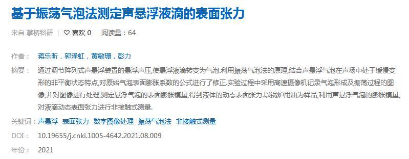 以鍋爐用油為樣品,利用聲懸浮氣泡的膨脹模量,對液滴動態(tài)表面張力進(jìn)行非接觸式測量。