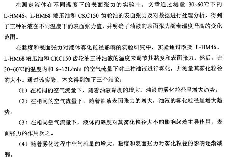 在黏度和表面張力對液體霧化粒徑影響的實驗研究中,實驗通過改變L-HM46、 L-HM68液壓油和CKC150齒輪油三種油液的溫度來調節其黏度和表面張力。然后,在30~60℃的溫度內和6~12L/min的空氣流量下對三種油液進行霧化,并測量其霧化粒徑的大小。通過該實驗,本文得到如下三個結論: