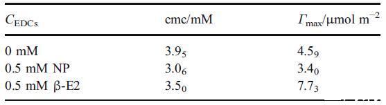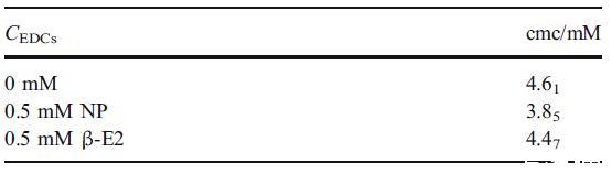 表 3 在含有 20 mM 磷酸鹽緩沖液和 0.5 μM 芘的 50 mM hp-β-CD 存在下,HTAB 溶液在不同 NP 或 β-E2 濃度下的 cmc 值