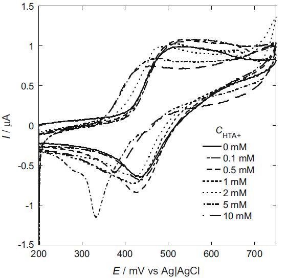 我們還研究了 HTA+ 陽離子的影響(圖 6)。 來自界面張力測量的 HTA+ 離子的 cmc 與圖 6 標題中所述的 CV 測量溶液相同,為 3.95 mM。 I2/I? 的陽極和陰極峰均高于不存在 HTA+ 時的峰。 陽極和陰極峰值電流的增加是由于被捕獲的 I? 和 I2 從 hp-β-CD 釋放到主體中,這是由 hp-β-CD 腔中的 I? 和 I2 置換引起的與 HTA+。 另一方面,隨著 HTA+ 的濃度增加到 cmc 以上,陽極和陰極峰值電流都變得低于預膠束濃度下的峰值電流。 在 I2 和 I- 鍵合到膠束經歷電子轉移之前,膠束必須轉向,使 I2 和 I- 面向電極表面。 它導致峰值電流的降低。 此外,陽極和陰極峰值電位都向負方向移動。 這表明溶解在 HTA+ 膠束中的 I2 比鍵合到 HTA+ 膠束表面的 I- 更穩定。 隨著 HTA+ 濃度增加到 5 mM,在 330 mV 處觀察到一個尖銳的吸附減少峰。 已知在不存在任何表面活性劑的情況下,在鉑電極表面形成的 I2 會吸附在電極表面 [19]。 在我們的系統中,HTA+ 在低 HTA+ 濃度下抑制了 I2 的吸附。 然而,隨著HTA+濃度的增加,形成了HTA+單層,導致電極表面HTA+單層中的I2被吸收。 隨著 HTA+ 濃度增加至 10 mM,吸附還原峰消失。 在這個濃度下,在電極表面形成的 I2 溶解到 HTA+ 膠束中。 因此,沒有觀察到吸附峰。