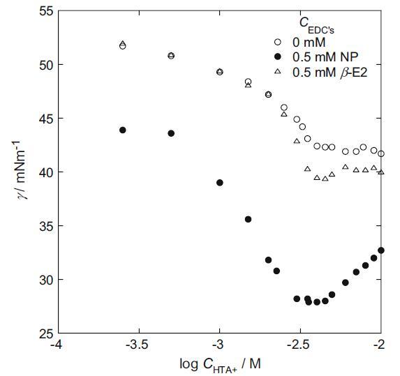 表 2 在含有 0.49 M Na2SO4 和 0.01 M H2SO4 的 5 mM hp-β-CD 存在下,HTA+ 溶液在不同 NP 或 β-E2 濃度下的 cmc 和表面過量 (Γmax) 值