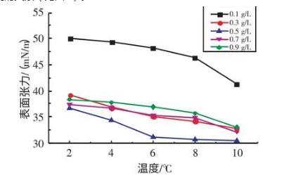 2.2.1不同溫度下十二烷基苯磺酸鈉溶液表面張力與濃度的關(guān)系實驗研究了在溫度為2、4、6、8、10℃條件下,SDBS溶液的表面張力與濃度的關(guān)系(見圖3)。由圖3可知,當(dāng)濃度在0.1~0.7 g/L時,隨著SDBS溶液濃度的升高,其表面張力逐漸減小;當(dāng)濃度在0.7~0.9 g/L時,隨著SDBS溶液濃度的升高,其表面張力逐漸增大。當(dāng)SDBS溶液濃度為0.7 g/L時,其表面張力取得最小值。