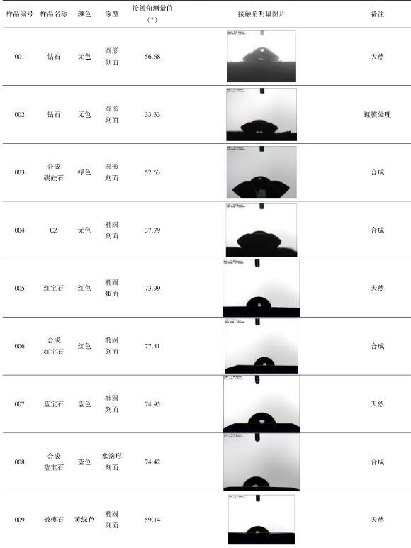 本文運用現代儀器(FTA200動態接觸角測量儀)測量了15個天然和合成寶玉石品種(鉆石、合成碳硅石、合成立方氧化鋯、碧璽、托帕石、翡翠、琥珀等),以及經覆膜和充填2種處理方法的寶玉石樣品(鍍膜鉆石、覆膜托帕石、覆膜翡翠、覆膜琥珀、充填碧璽)的表面接觸角,并運用公式計算其表面張力。