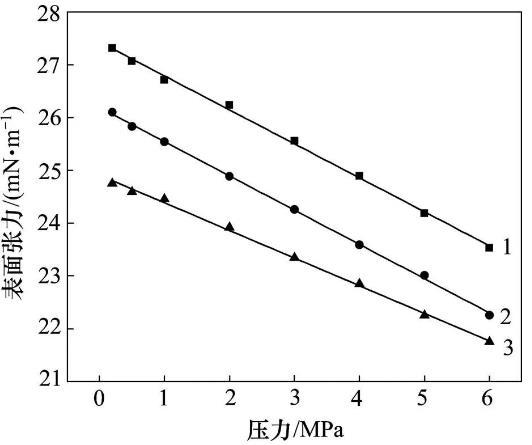 為了研究溫度和壓力對煙道氣?稠油平衡表面張力的影響,分別在80,100和120℃下進(jìn)行實驗,圖2所示為不同溫度下煙道氣?稠油平衡表面張力隨壓力變化曲線。由圖2可見:當(dāng)氣體壓力從0.2 MPa升高到6 MPa,在80℃時,煙道氣?稠油表面張力由27.31 mN/m減小到23.53 mN/m,降低了13.84%;在100℃時,煙道氣?稠油表面張力由26.10 mN/m減小到22.26 mN/m,降低了14.71%;在120℃時,煙道氣?稠油表面張力由24.75 mN/m減小到21.75 mN/m,降低了12.12%。當(dāng)溫度一定時,煙道氣?稠油系統(tǒng)的平衡表面張力隨著壓力的增大而減小,并呈較好的線性關(guān)系。這是因為溫度一定時,壓力增大,煙道氣在稠油中的溶解度增大,使得平衡表面張力減小。當(dāng)壓力一定時,煙道氣?稠油系統(tǒng)的平衡表面張力隨溫度的升高而減小。這是因為煙道氣的主要成分是N2,N2在稠油中的溶解度隨著溫度升高而增大。