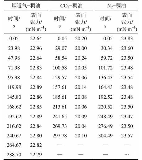 由于煙道氣在原油中具有一定的溶解度,油滴形成后,煙道氣會向原油中擴(kuò)散、溶解,一直持續(xù)到油滴被煙道氣飽和。為了檢測氣體向原油中溶解、擴(kuò)散對表面張力的影響,對煙道氣?稠油系統(tǒng)的動態(tài)表面張力進(jìn)行測定。圖1所示為120℃和4 MPa下測量的煙道氣?稠油動態(tài)表面張力,其中煙道氣組成為80%N2+20%CO2(摩爾分?jǐn)?shù)),并與CO2?稠油和N2?稠油的表面張力進(jìn)行對比。由圖1可以看出動態(tài)表面張力的變化可以分為2個階段:第1個階段為波動階段,在氣體擴(kuò)散的初始階段,動態(tài)表面張力存在一定的波動,約100 s,說明氣體向稠油中擴(kuò)散會持續(xù)一段時間;第2個階段為平衡階段,氣體?稠油的表面張力波動很小,幾乎是一個常數(shù),在相同的溫度和壓力下,CO2?稠油的表面張力最小,N2?稠油的表面張力最大,煙道氣?稠油的表面張力介于二者之間,表1所示為前300 s稠油與不同氣體作用表面張力的實驗值。