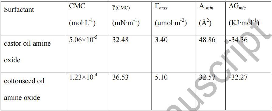 由表2可知,蓖麻油酰胺氧化胺和棉籽油酰胺 氧化胺將水的表面張力降低到最小值約 在 5.06×10-5 mol/L 的濃度下為 32.48 mN/m,在 5.06×10-5 mol/L 的濃度下為 36.53 1.23×10-4 mol/L,表明它們的表面活性很高。 和....相比 一些已報道的氧化胺表面活性劑,[12] 如十六烷基二甲基 氧化胺、十八烷基二甲基氧化胺和椰油酰胺丙基二甲基胺 氧化物等,其CMC值通常在10-4范圍內 ~10-3 mol/L, 這些 CMC 值較低。 這可能是因為幾種酰胺的混合物 氧化胺具有協同增強的作用,提高了表面 活動總體上。 還可以發現,蓖麻油的 CMC 和 γ(CMC) 值 酰胺氧化胺遠低于棉籽油酰胺氧化胺,后者 可能是由于蓖麻油酰胺氧化胺中存在-OH。 [13] 在 另外,從表 2 中的數據可以看出,蓖麻油的Γmax 值 酰胺氧化胺低于棉籽油酰胺氧化胺,而 前者的Amin值大于后者。 這一結果可能歸因于 烷基鏈的長度。 此外,ΔGmic 的負值表明 9 在 25 oC 時,膠束化是自發的,這意味著這兩種天然植物油 酰胺胺氧化物在空氣-水界面有極好的吸收能力 在溶液中形成膠束。