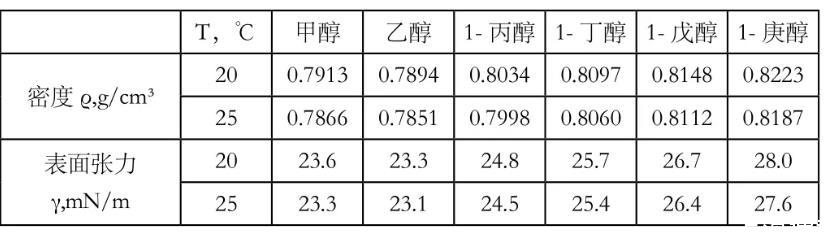 表2醇類在不同溫度下的密度和表面張力