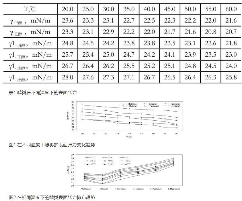 表1醇類在不同溫度下的表面張力