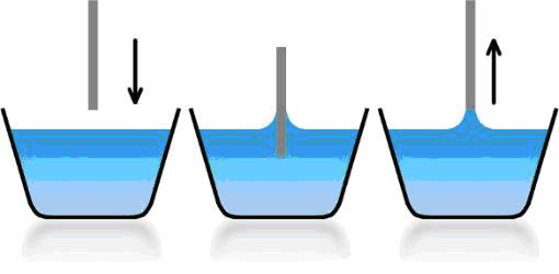 為了給用戶提供最為精確的表面張力/壓力,Kibron發(fā)展了一種新的精度超過0.2微克的微量天平,這種靈敏度與“最大拉力”原理相結(jié)合進(jìn)行測量。測量時(shí)先將一個(gè)探針浸入到界面,然后慢慢拔出,記錄彎液面(粘附在探針上的液面)的重量,該重量用于計(jì)算表面張力。